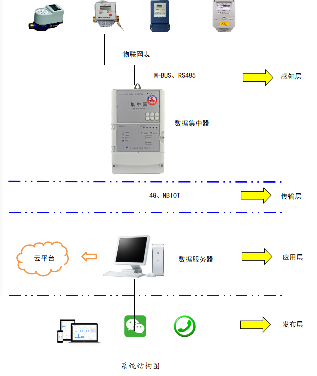 系统按照物联网的架构进行设计,其中感知层主要包括物联网表、智能传感器、数据集中器等设备,传输层主要包括MBUS、RS485等有线网络以及4G、NBIOT、LORA等无线网络,应用层包括专用管理软件平台和数据库等,发布层包括移动平台APP、微信小程序、手机短信等。